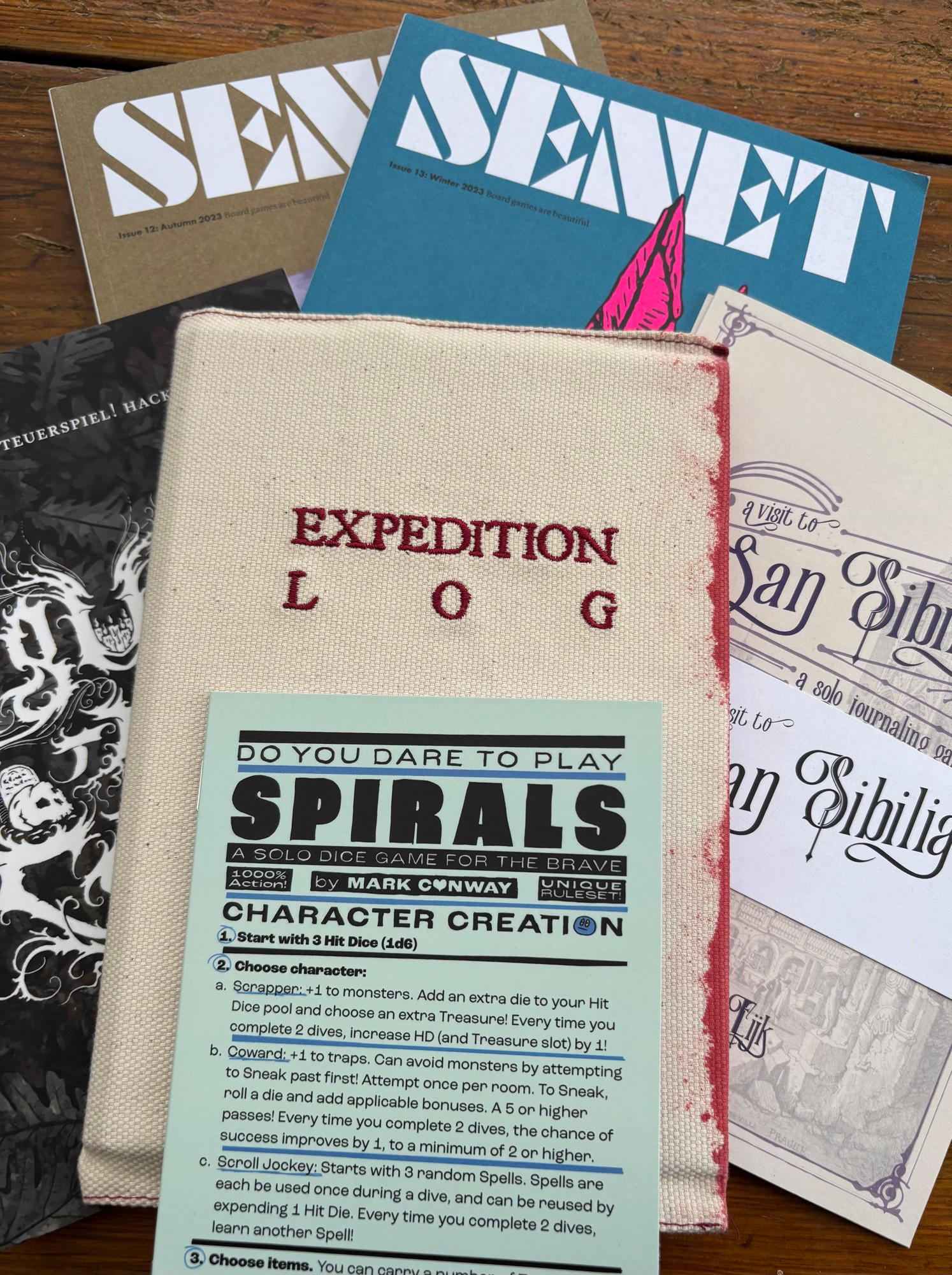 A number of my newly-acquired TTRPG books, including WANDERHOME, I BURY THE GODS, EXPEDITION LOG, SPIRALS, A VISIT TO SAN SIBILIA,CRUCIBLE and KNIGHT FORLORN, plus a pair of issues of SENET.